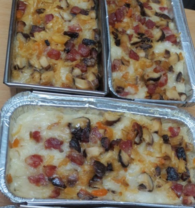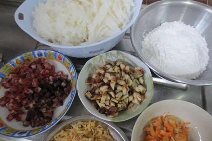 將拌好的蘿蔔糕糊倒入糕盆中,抹平,鋪上留起的配料。