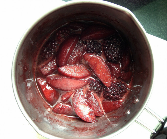 取小鍋倒入波特酒,加入水蜜桃煮至軟,續加紅酒醋,蜂蜜,濃縮至原來一半的量,加入黑莓即可熄火