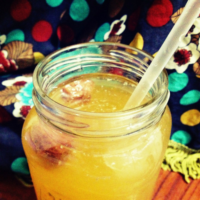接著將水果汁(金桔,檸檬)與茶混和攪拌之後加入梅子,蜂蜜與冰塊。(可以將切半的果皮放入增加美感喔!!)