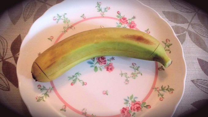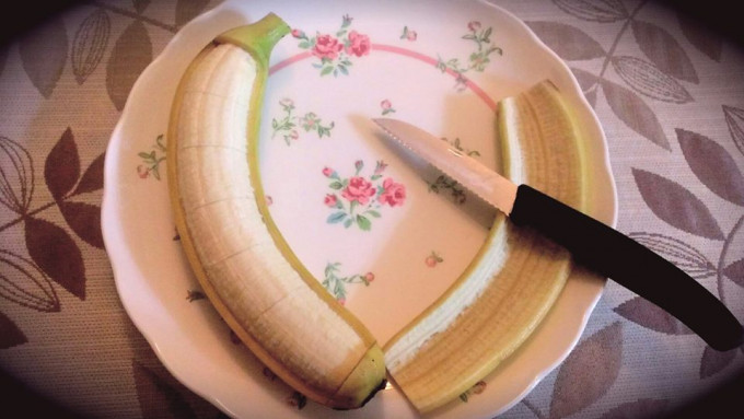 先將香蕉依右(下)圖 圖示切開。(只切皮)