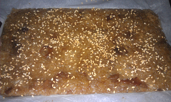 取一鐵盤舖上烘焙紙,將糯米放入整完形狀後,放涼再切即可