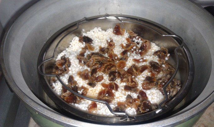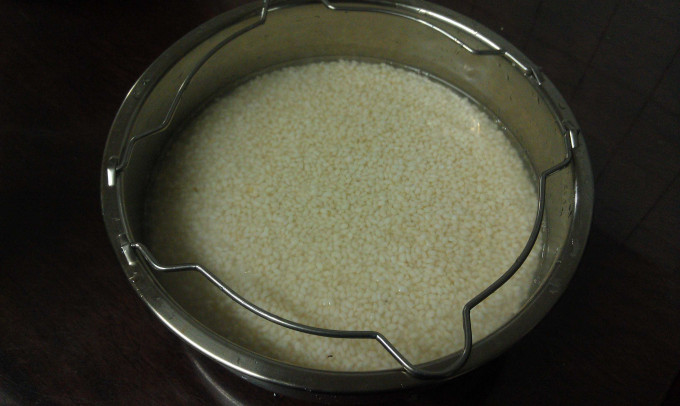 糯米洗過先瀝乾,再加入一杯量米杯的水泡上 2小時以上