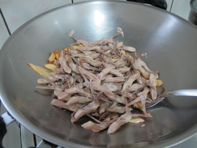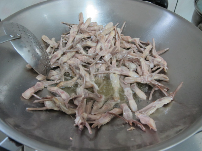 取ㄧ鍋熱油,依序將蒜頭.薑片.鴨舌過油備用