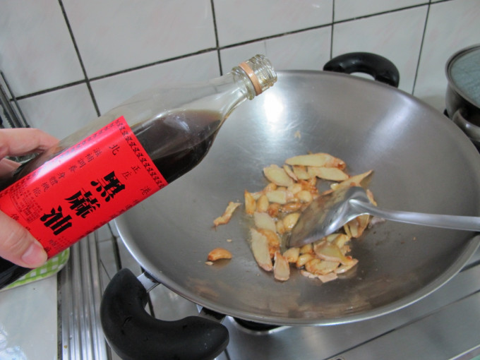 將蒜頭和薑片在入鍋爆炒片刻,再倒入約一匙的麻油
