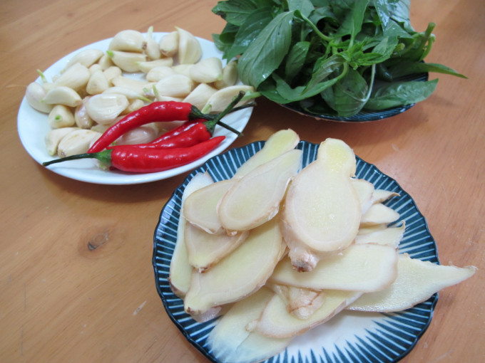 薑切片.九層塔洗淨.蒜頭剝好膜備用