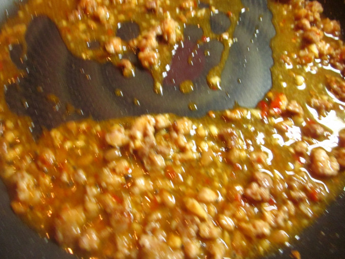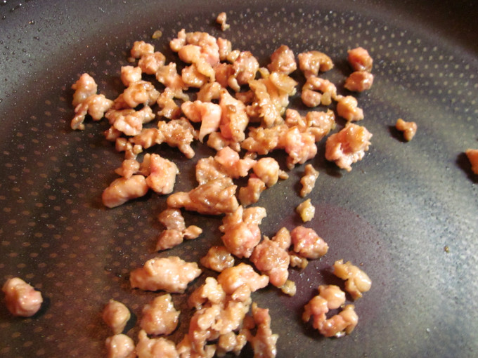板豆腐切小塊.粉絲泡水剪半.鍋中不放油炒香絞肉