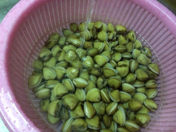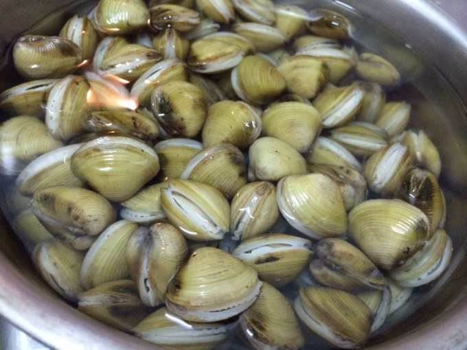 蜆仔靜置水裡,將沙子吐乾淨,洗淨沙土放鋼盆裡,加水靜置於爐子上,水需淹過蜆仔