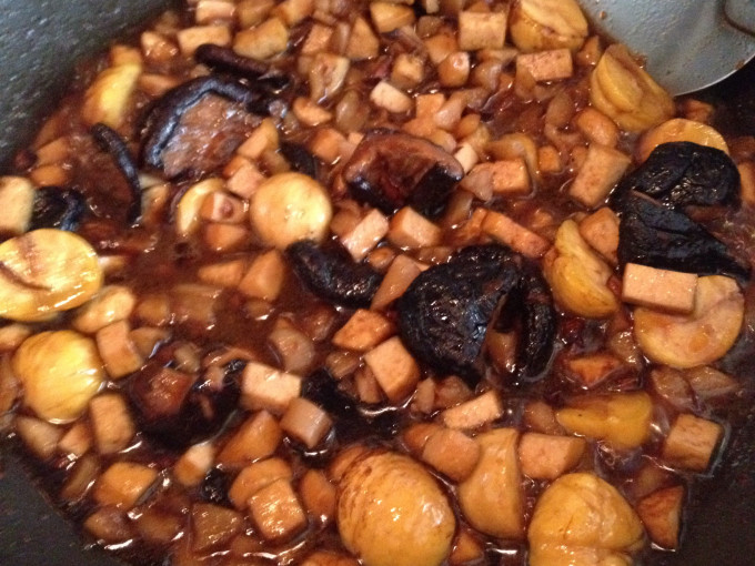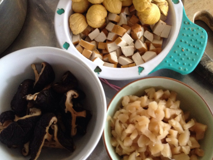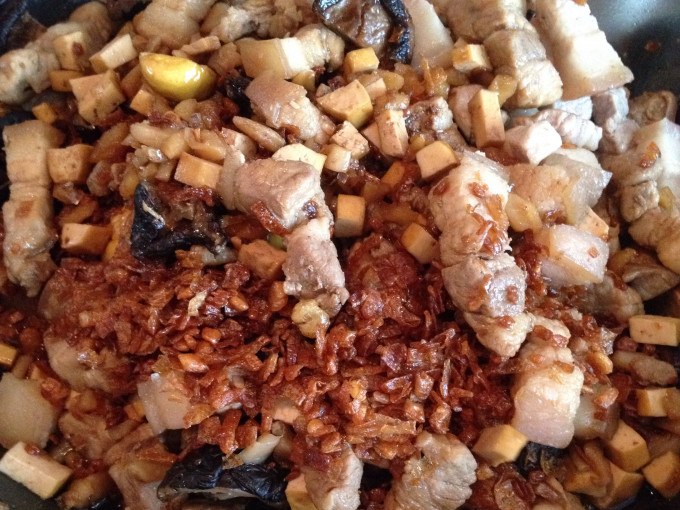 取2大匙油爆香蝦米,續加入肉炒變白,再加入香菇炒出香氣,最後加入豆干丁、菜脯、栗子,翻炒出香氣。