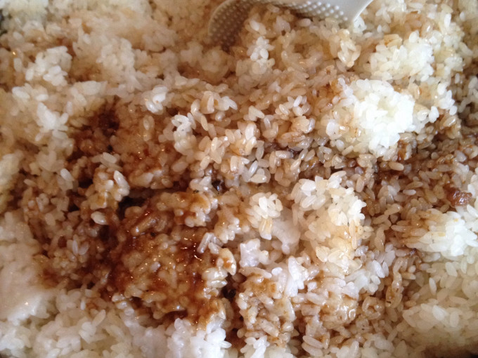 此時飯也差不多蒸好了,趁熱拌入醬汁攪拌均勻。