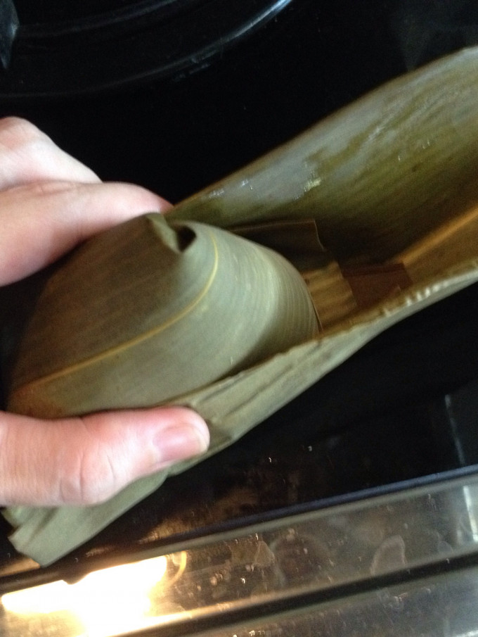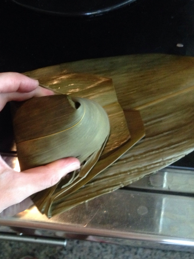 將兩旁粽葉凹貼粽身,多餘的粽葉也向下凹貼粽身。