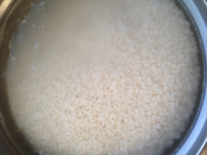 糯米洗淨泡水一夜;白米洗淨加入泡好的糯米拌勻,泡水備用。