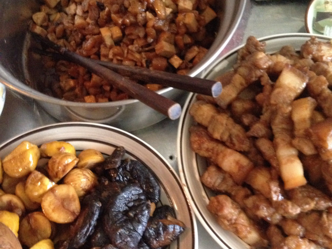 將煮好的料分五種種類夾出備用。(栗子、香菇、肉、其他、醬汁)