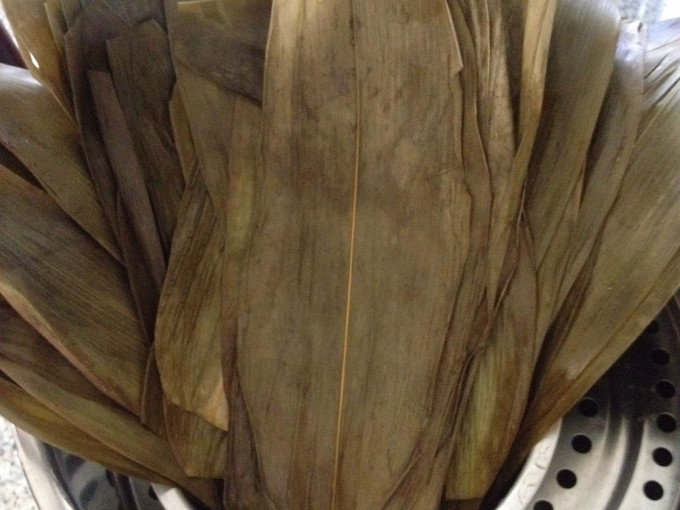 粽葉泡熱水20分鐘,刷洗乾淨,去頭、尾,瀝乾備用。(此時可先泡香菇讓它軟化)