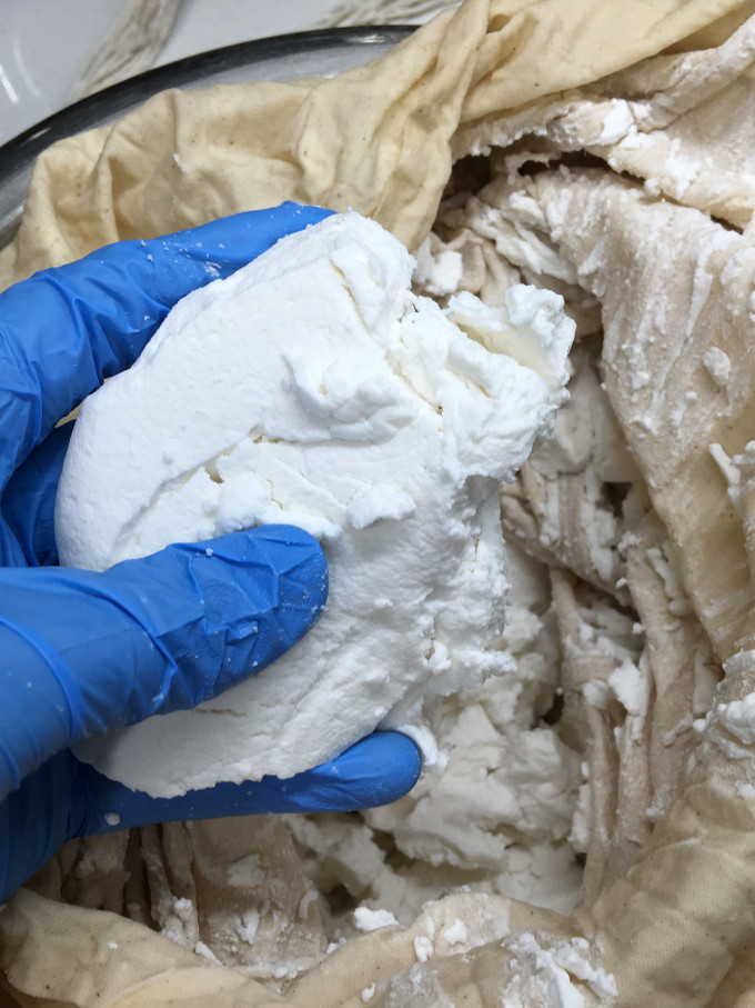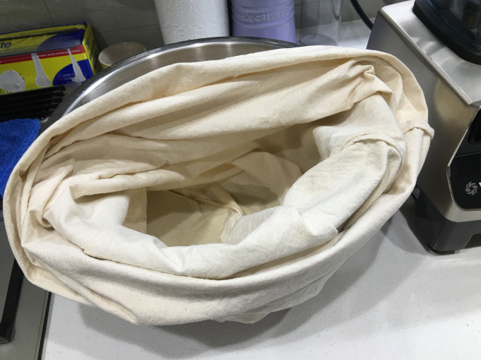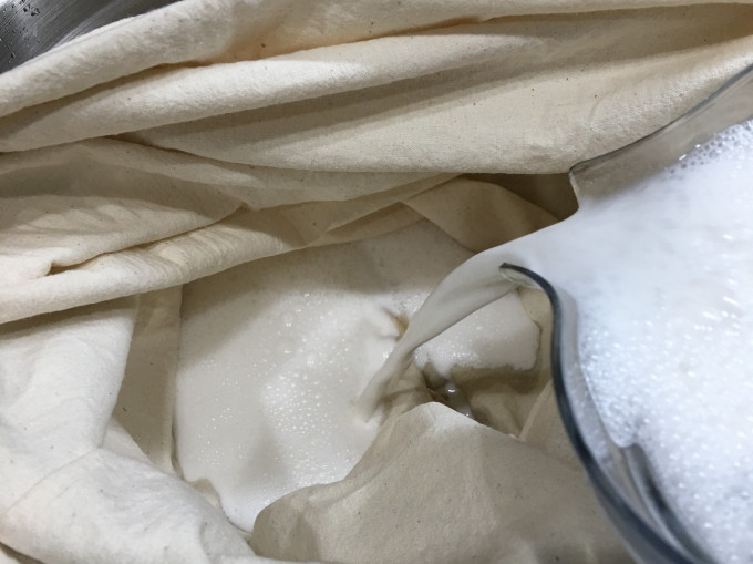 用手將水擠出,用手擠不出來的最後拿重物壓在米袋上,把水分整個壓乾。