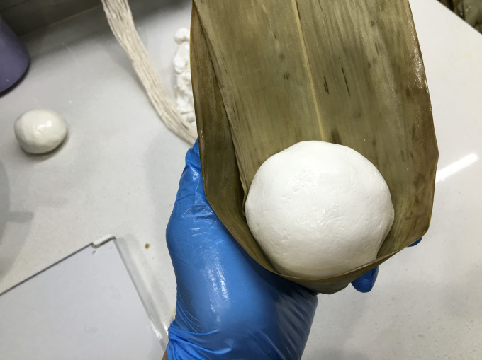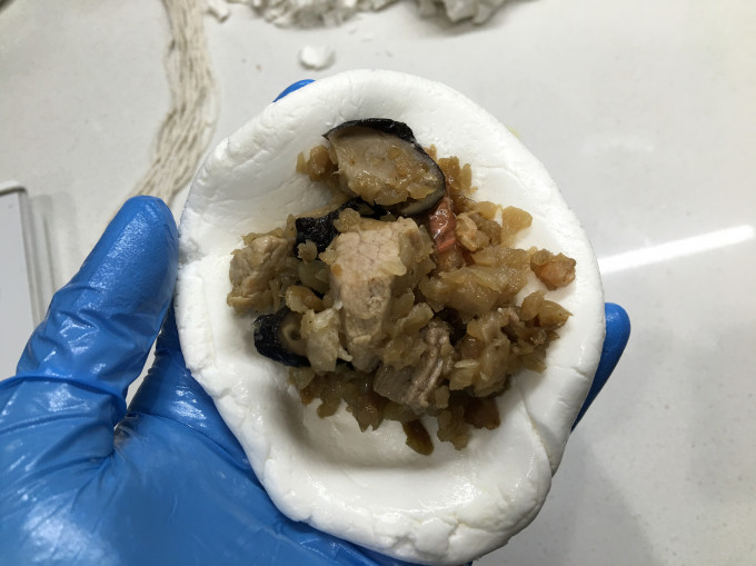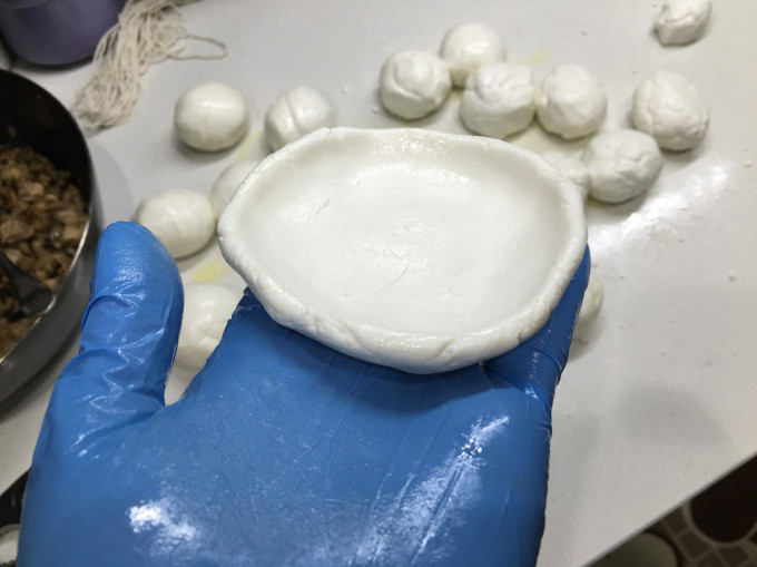 外皮每一顆大約90公克,利用包包子的方法,中心點比較厚,邊邊比較薄。
