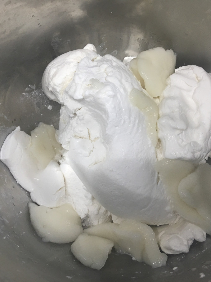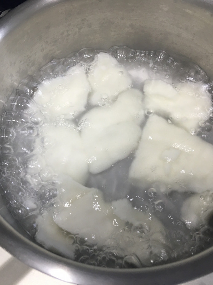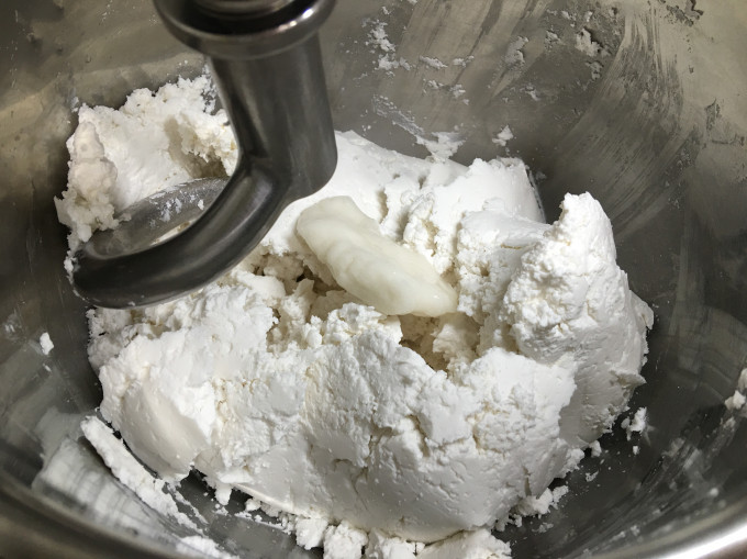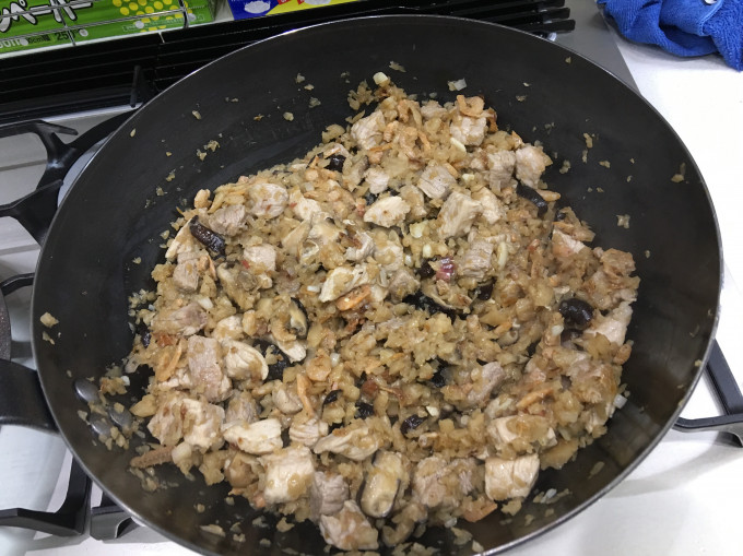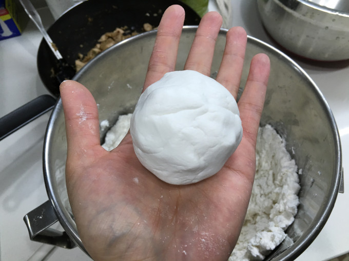 將煮好的糯米團加入脫水後的糯米開始用手揉成團。
