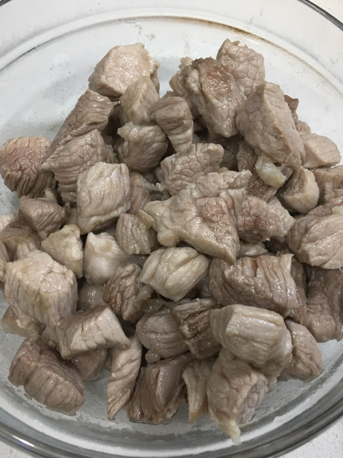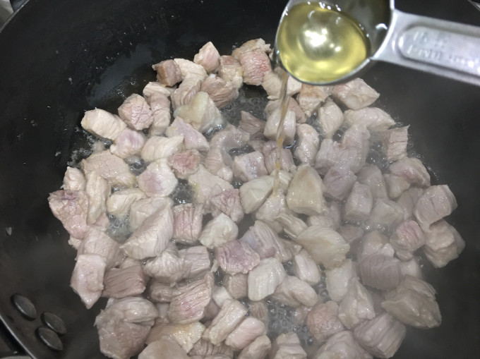 拌炒豬肉至8分熟,加入一大匙味醂去腥,炒好撈起備用。