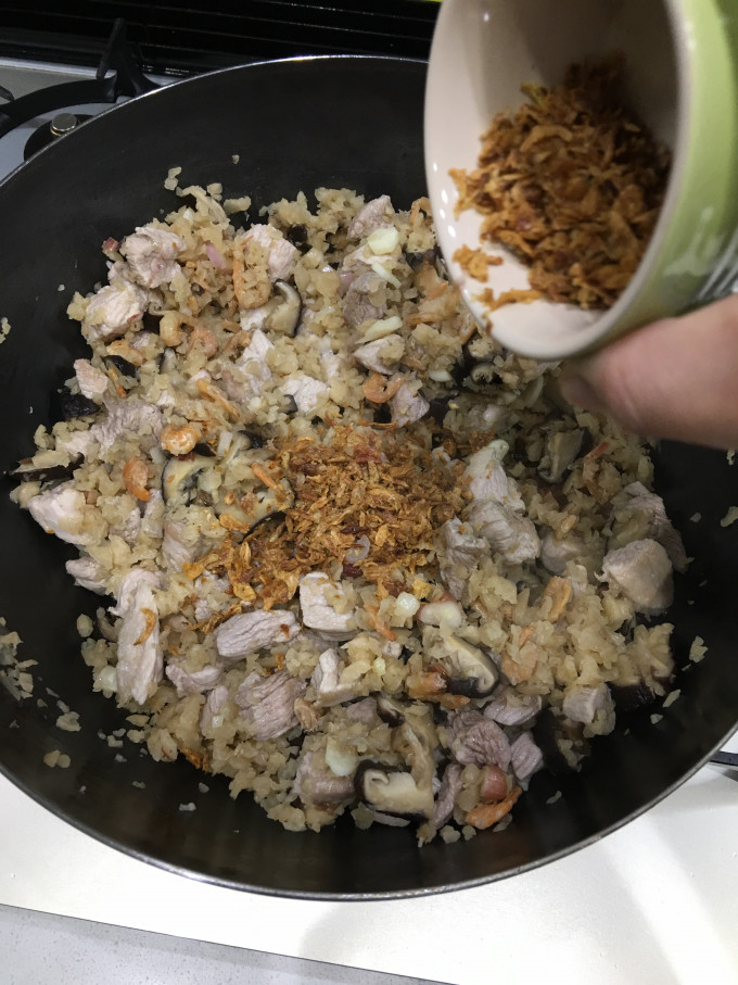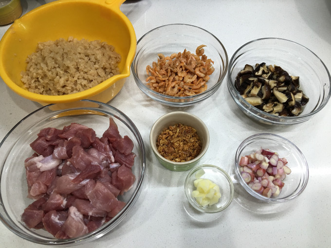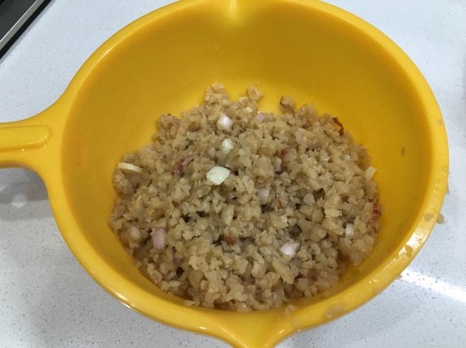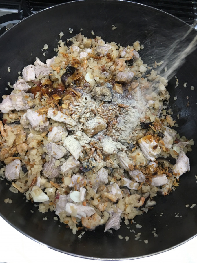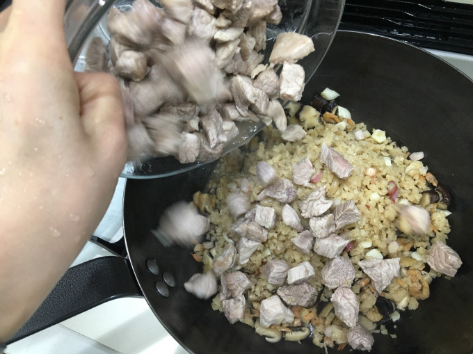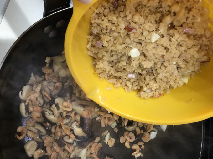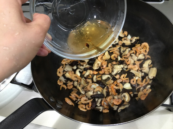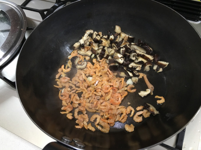 將蒜頭、蝦米、香菇,拌炒至有香氣出來。