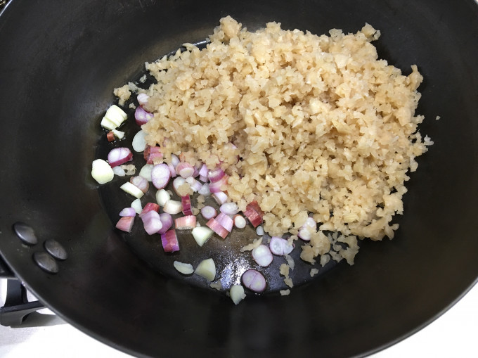 加入兩大匙橄欖油,將蒜頭、紅蔥頭、菜圃全部一次放入,拌炒到香氣出來,起鍋放旁邊備用。