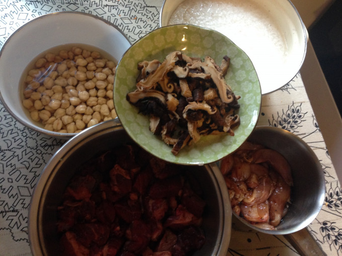 然後準備內餡的部分,我的家人喜歡吃原味,老媽不吃牛肉,所以我就準備了兩種餡料,牛肉和雞肉的。兩種都是前一天的晚上切好後用醬油,薑末,胡椒粉,辣椒粉,鹽拌好醃過夜才會入味。這裡很難買得到生的花生米,所以我用鷹嘴豆也就是雞豆來代替。雞豆和糯米都分別泡好如圖備用。泡好的糯米和雞豆瀝乾水以後放在一個大的盆裡