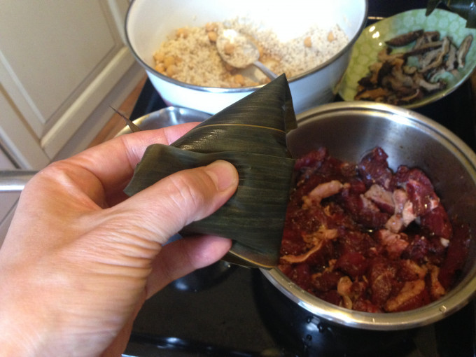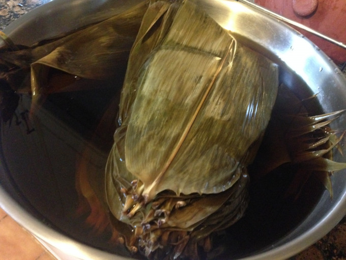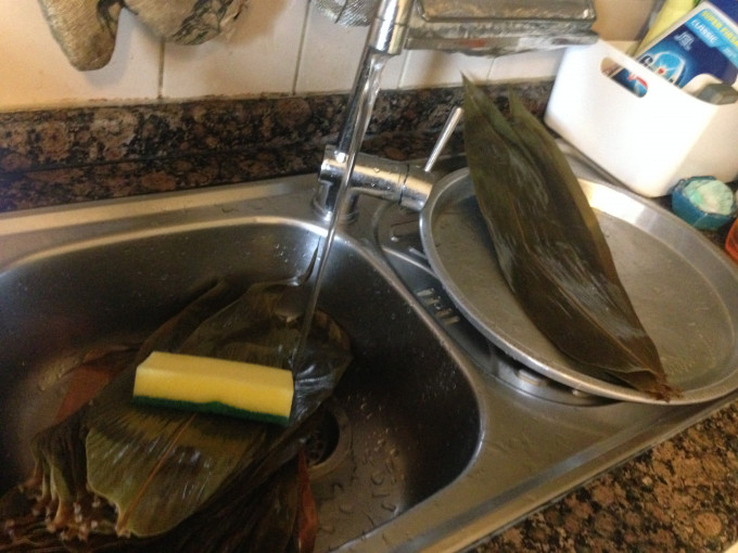 老媽通常喜歡用新鮮翠綠的竹葉,可是為了攜帶方便,買了這種乾的竹葉帶來,準備的時候比較麻煩一些,我是把竹葉放在炒菜鍋裡,加入適量的水,蓋過竹葉,最好上面放個重盤子,讓竹葉確實浸泡,然後開火蓋上鍋蓋開火,等水開了以後關火,浸泡一個晚上,或是至少4個小時,把竹葉泡軟。