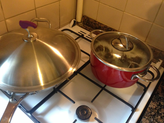 再來就是找兩個鍋,把粽子放進去,加入冷水,最好是淹過粽子,然後蓋上鍋蓋,不要完全蓋緊,大火,煮上3個小時,中間記得添水數次,還有耐心的等候~