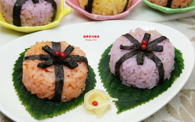 並放上作法12的海苔圈即可完成,漂亮又好吃的彩米壽司喔!