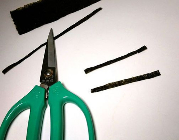 1用剪刀裁取海苔片,剪成長條型