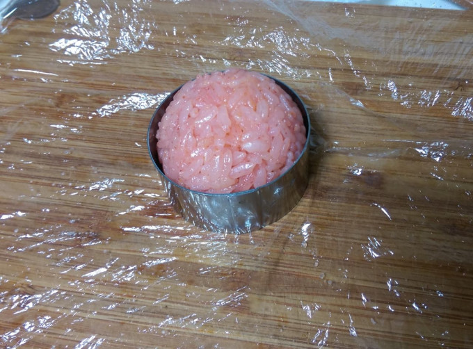 在放入圓形模內,並用保鮮膜壓著彩米糰,讓彩米糰更定型喔!