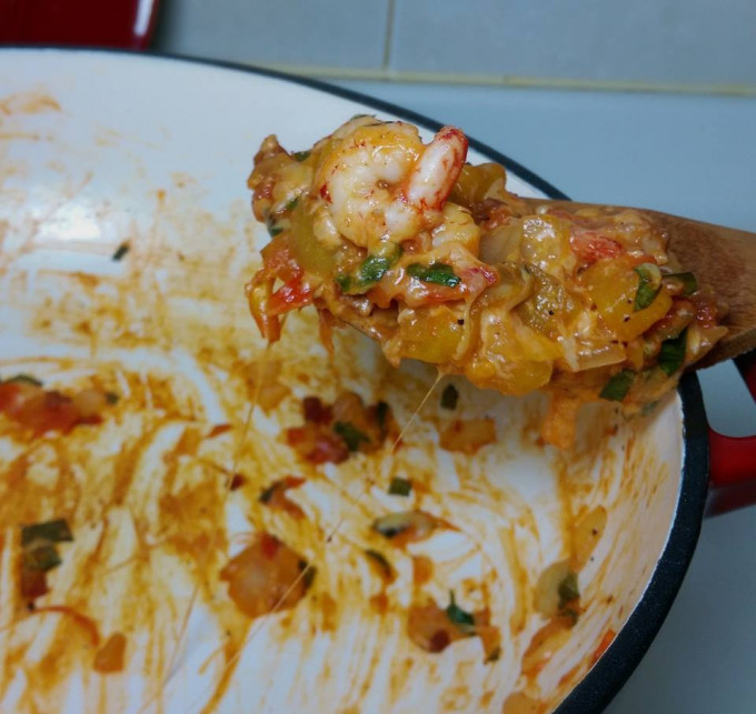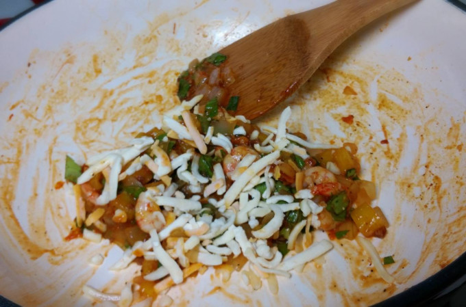 拌炒後,加入8-9材料再度拌勻,再加入起司絲