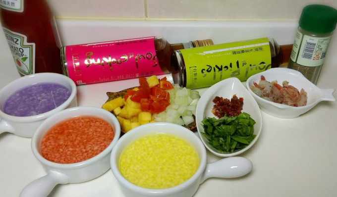 先將彩色米倒入器皿中,煮熟即可! 彩色米為免洗米,不需再洗米。最佳比例米:水=1:1.35~1.5(杯)浸泡10分鐘會更Q唷^^~ 浸泡完畢後放入電鍋蒸煮(內鍋一杯水即可)