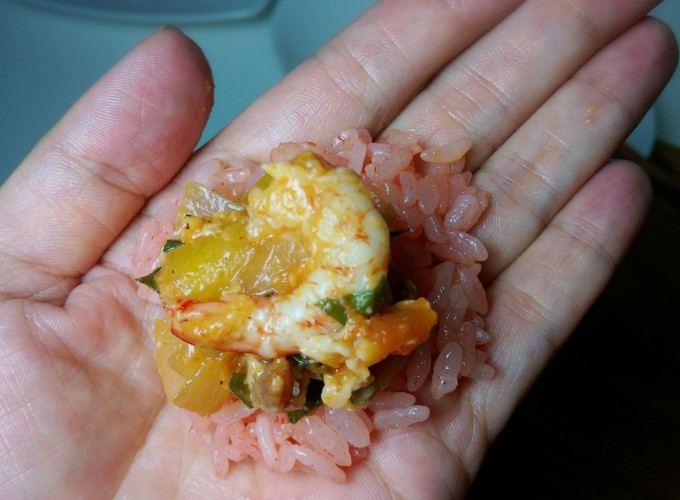 1手沾少許冷開水,再取少量的彩米在手上,並且放入炒熟的內餡!