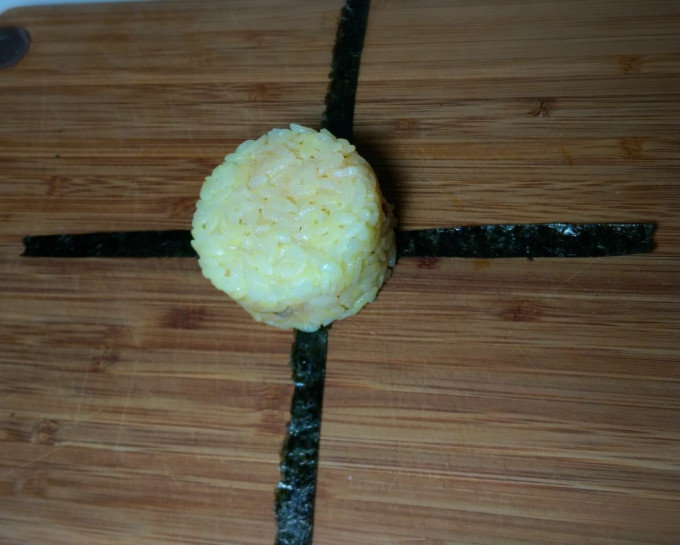 將1海苔段以十字形擺入,再放入整好的彩米糰,再將海苔段對黏彩米及可!