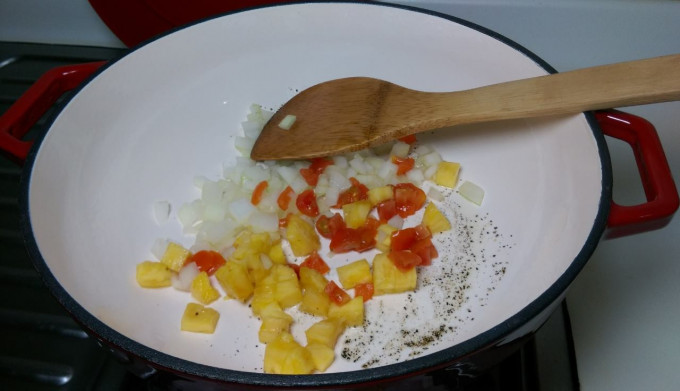 熱鍋加入少許植物油,加入黑胡椒炒香,並且放入3-6材料拌炒