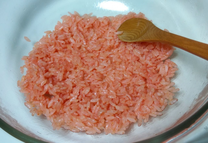取出已蒸熟的彩米放入容器哩,並且加入10cc的白醋快速拌勻,散熱!