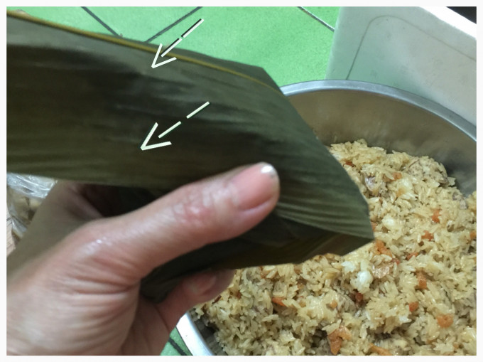 兩張粽葉頭尾交錯相疊,於1/3處對凹成漏斗狀