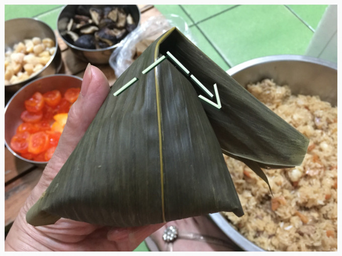 再以棉繩緊緊的繞著粽子兩圈,打上活結即可。(拉緊的時候將粽子往下拉,不要以手拉線,手才不會痛)