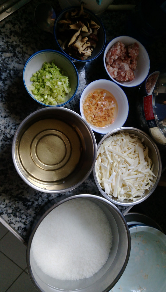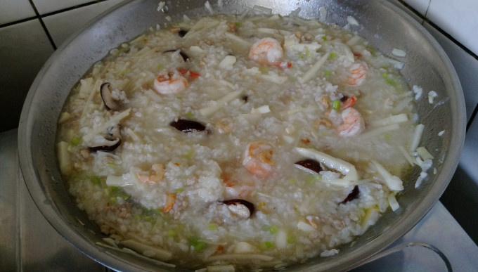 香菇、蝦米及絞肉(不用等肉熟)炒出香氣後下筍絲略為拌炒,再下白米拌炒,倒入泡香菇及蝦米的水持續拌炒兩三分鐘,加入高湯(不用ㄧ次加完,第一次先加五分之三),以中火蓋鍋概燜煮15-20分。中間要不斷開鍋蓋攪拌以免米黏住鍋底,要煮到米跟高湯有融合,飯有爛才算成功。