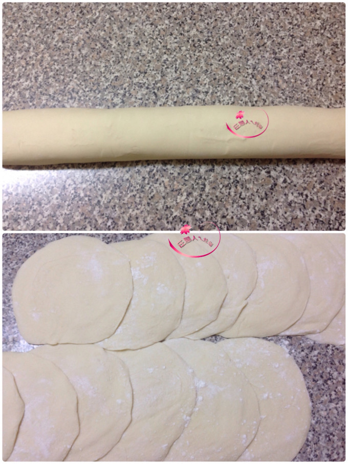 麵糰打到光滑,揉搓成長條狀,切12~14等份桿成圓片~