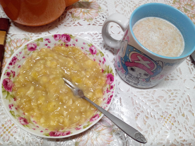 香蕉壓成泥加泡牛奶(麥片)裡攪拌均勻
