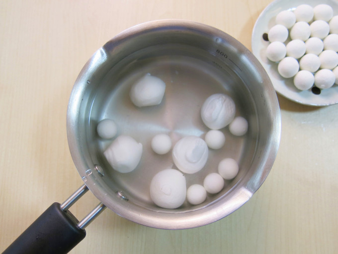湯圓放置熱水煮,待湯圓浮起煮熟,可撈出放碗裡備用。