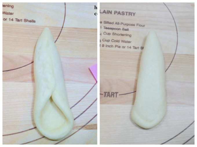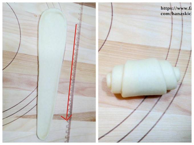 再右手用桿麵棍.左手輕拉麵糰下方.桿成水滴狀.長25公分