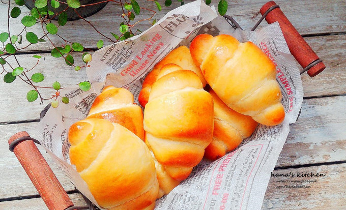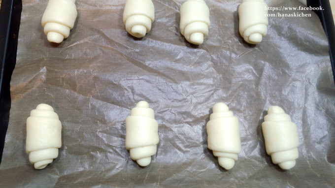 全部捲完之後.上面噴些水.讓它進行第2次發酵到1.5-2倍大後塗上蛋液2次(份量之外).烤箱預熱180度後放入烤箱13-14分鐘.