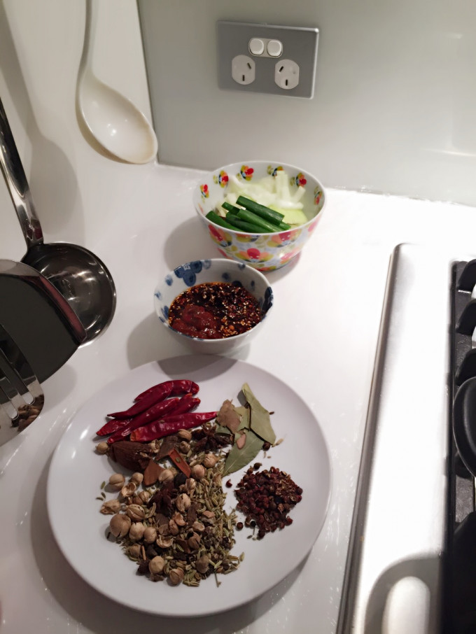 把鍋裡調味料A(可留一些花椒)撈起來,在倒入剛剛撈出的油轉中火,爆香調味料B中的蒜頭和薑,在加辣豆瓣醬和朝天椒麻辣醬。