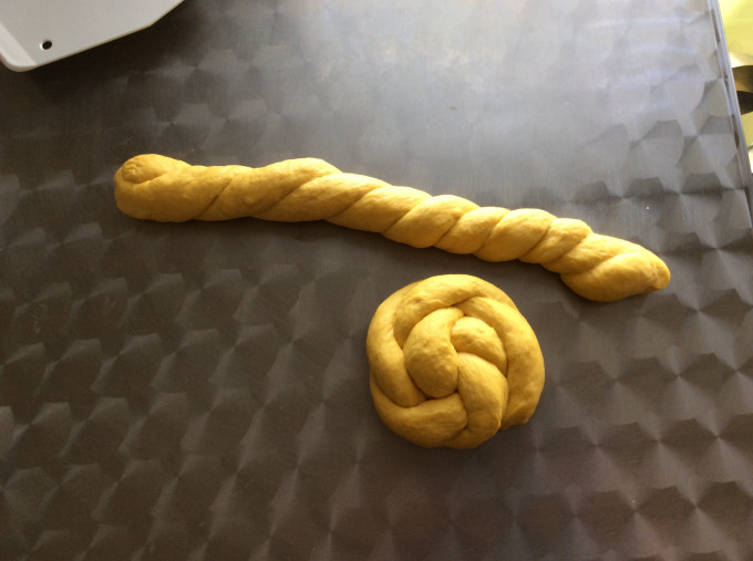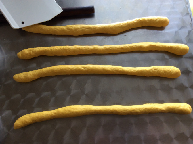 將麵團按扁擀成楕圓片後捲起,然後搓成長條。