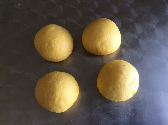 發好的麵團壓出空氣,分成4等份,滾圓後鬆弛10分鐘。