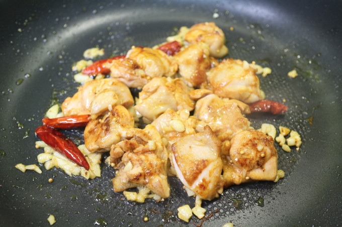 把雞肉擱在鍋邊,再把蒜切碎下鍋,乾辣椒下鍋炒香