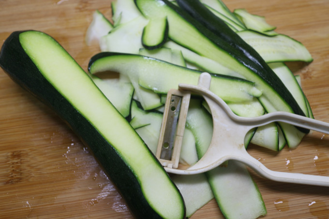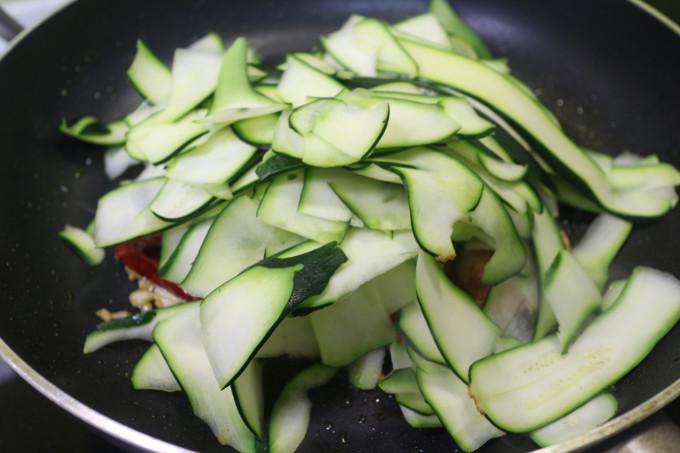 加進剛剛刨好的櫛瓜片,加上適量的鹽巴調味快炒即可