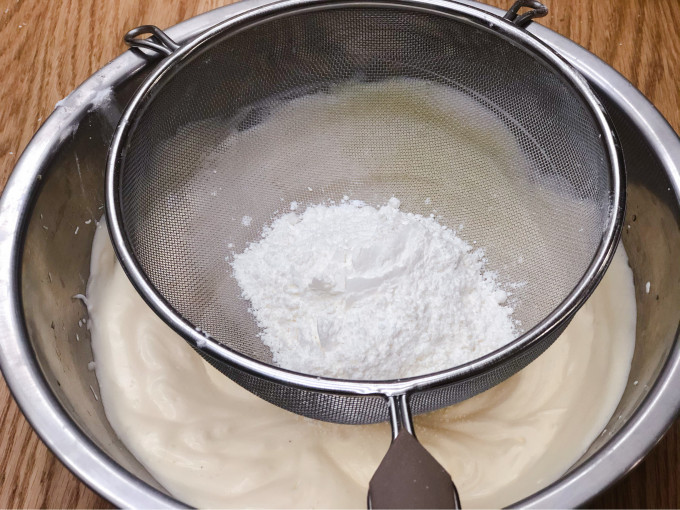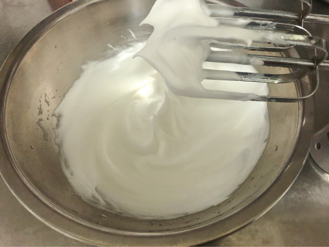 砂糖分三次加入,打發至拉起打蛋器有立角且呈現光澤感的蛋白霜。