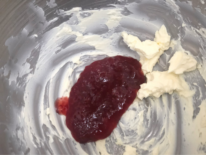 《製作草莓乳酪》奶油乳酪回室溫以電動打蛋器打軟後,加入草莓果醬拌勻。再倒入動物性鮮奶油打發。